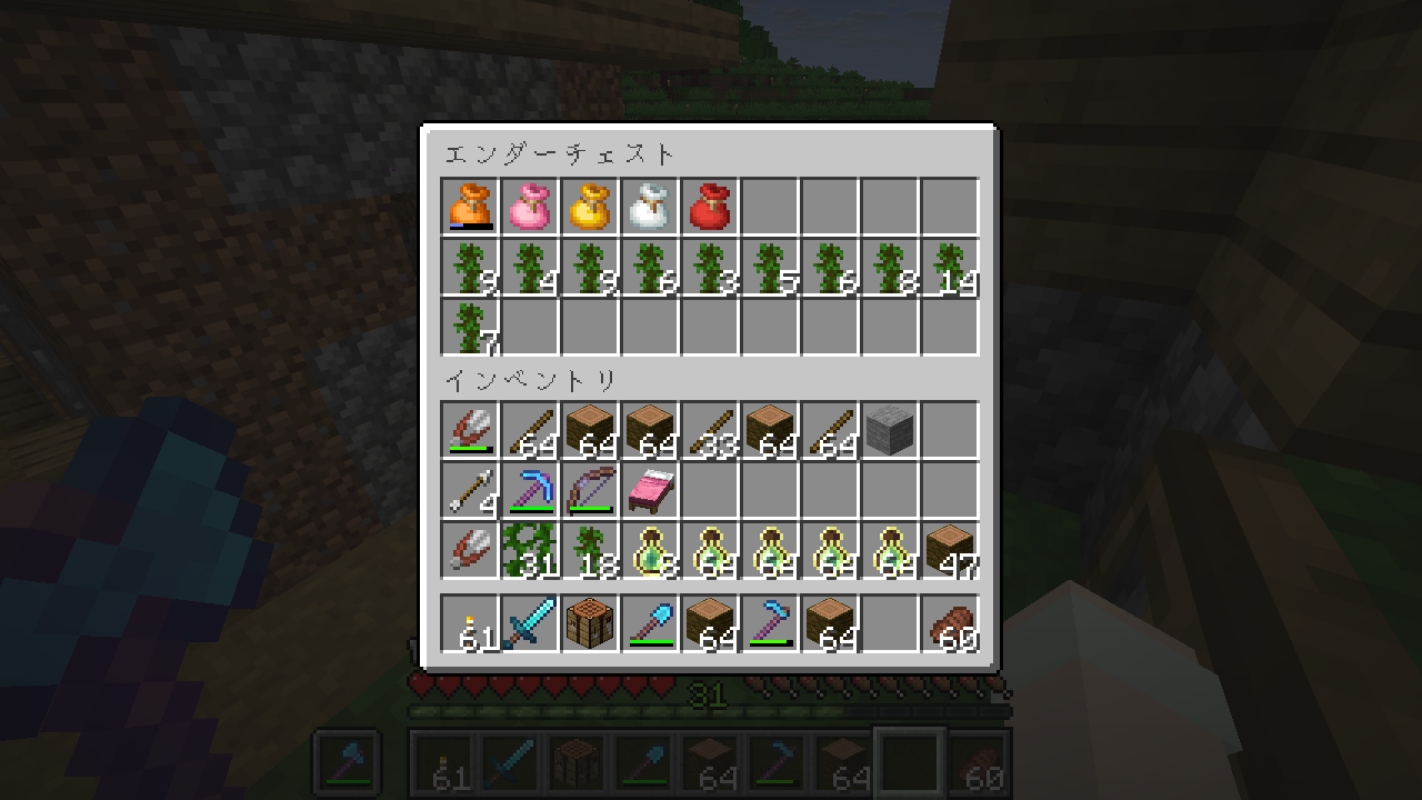 では実際にサバイバルで木こりをした際に、ジャングルの木とダークオークの木で葉からドロップする数を調べてみました。