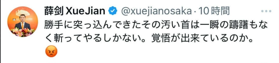 - 中国の大阪総領事「その汚い首は斬ってやるしかない」 高市首相の台湾有事巡る答弁に投稿 – 産経ニュース ↩︎